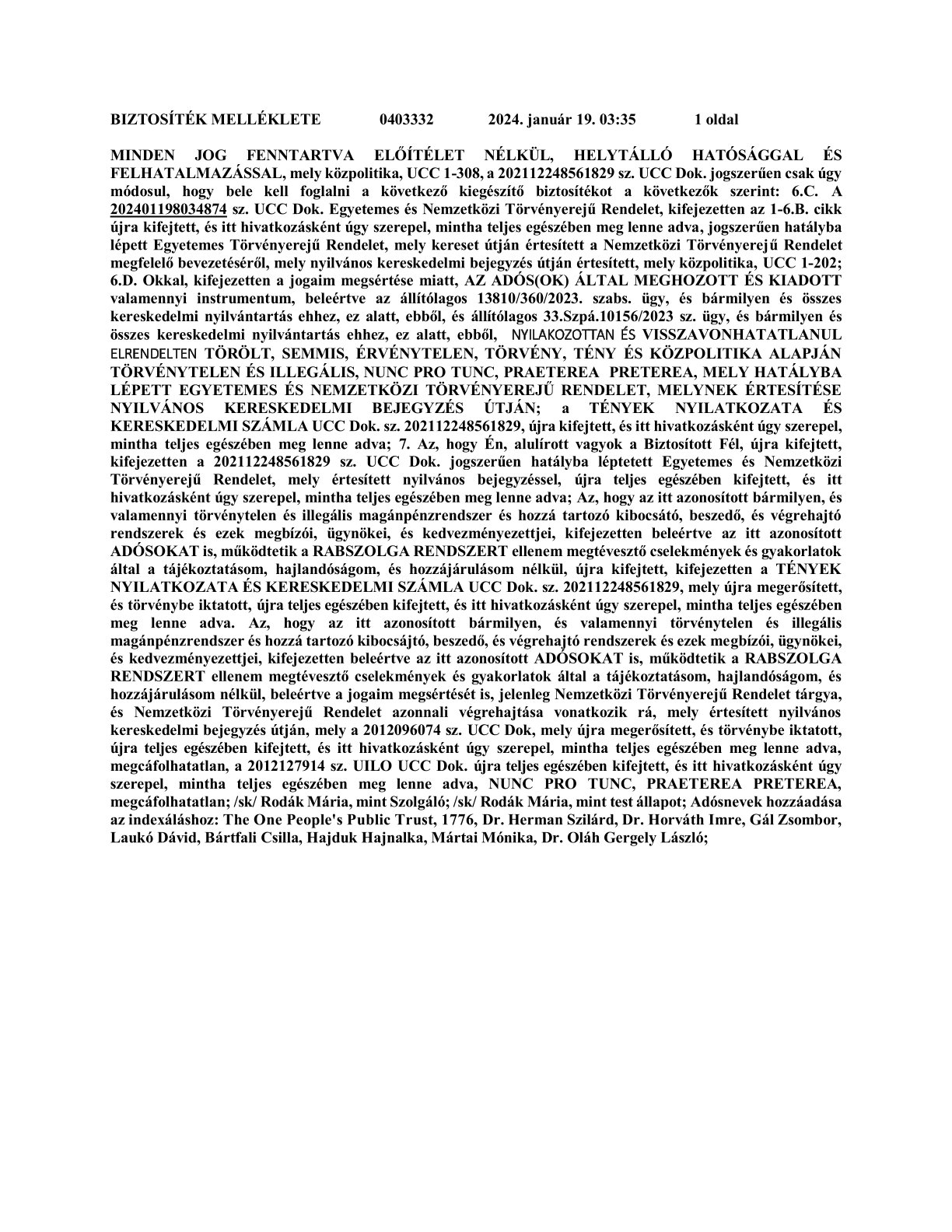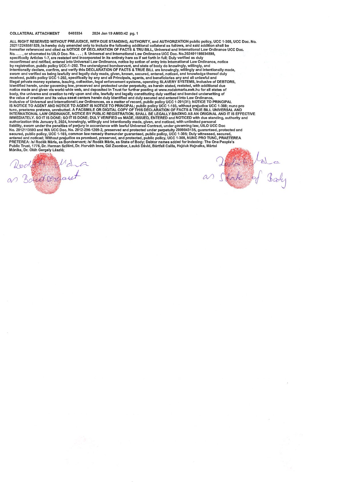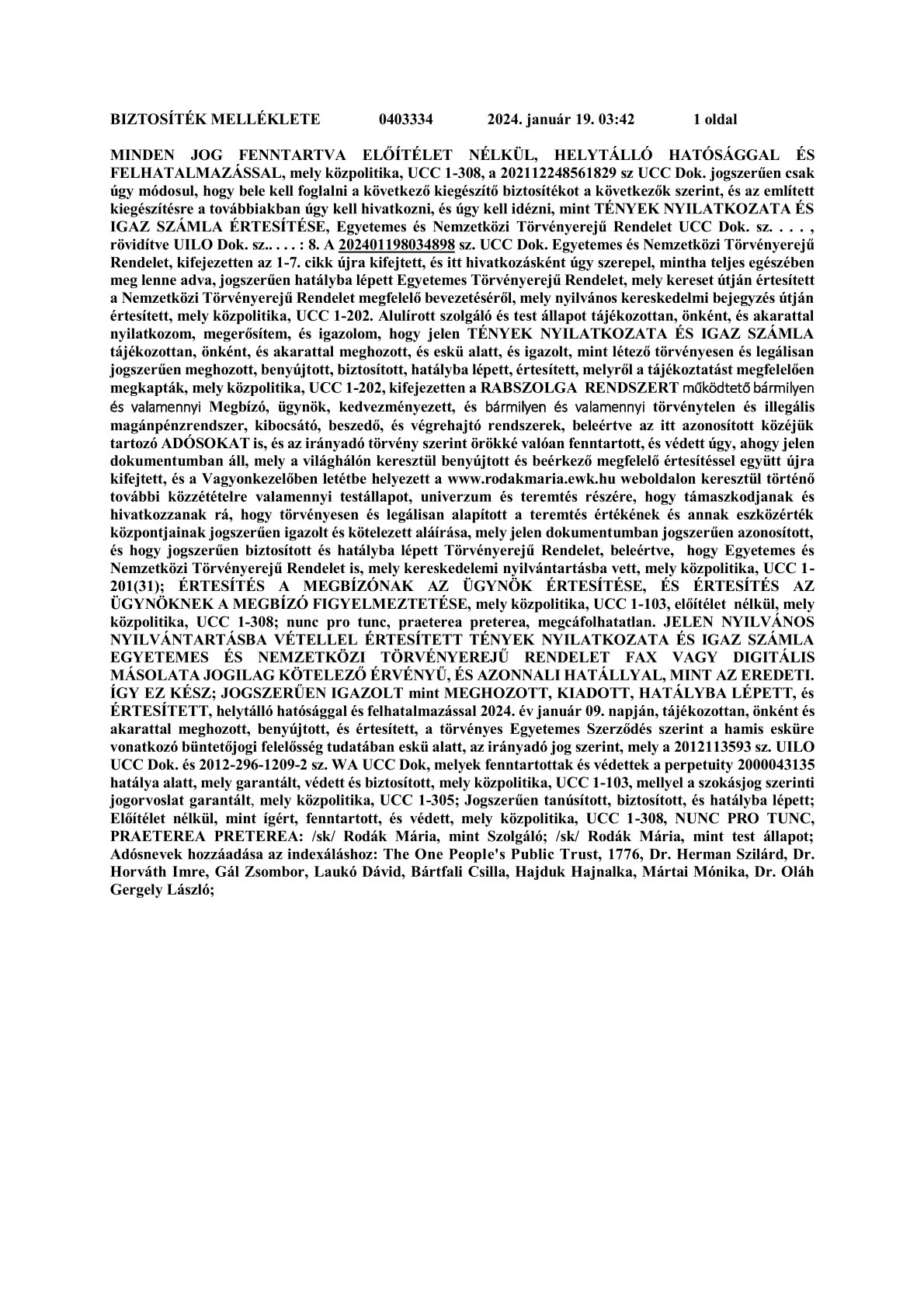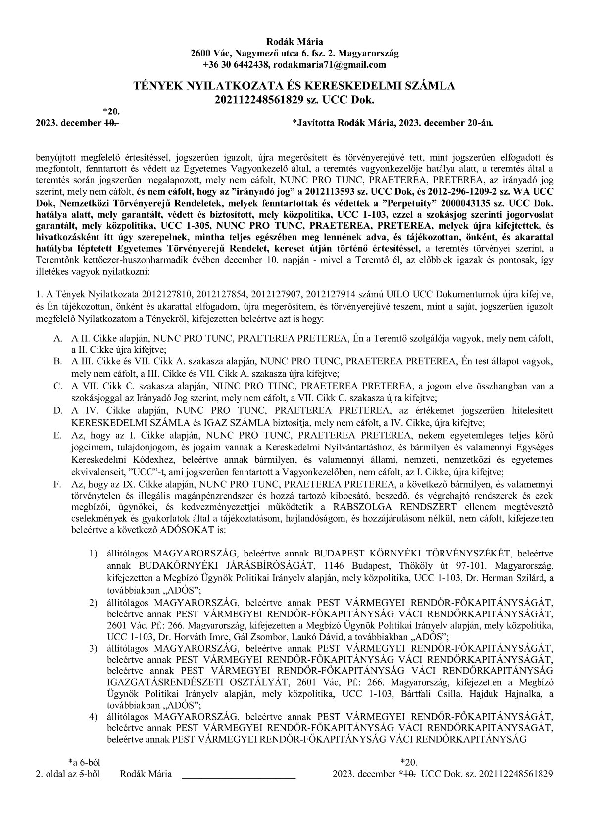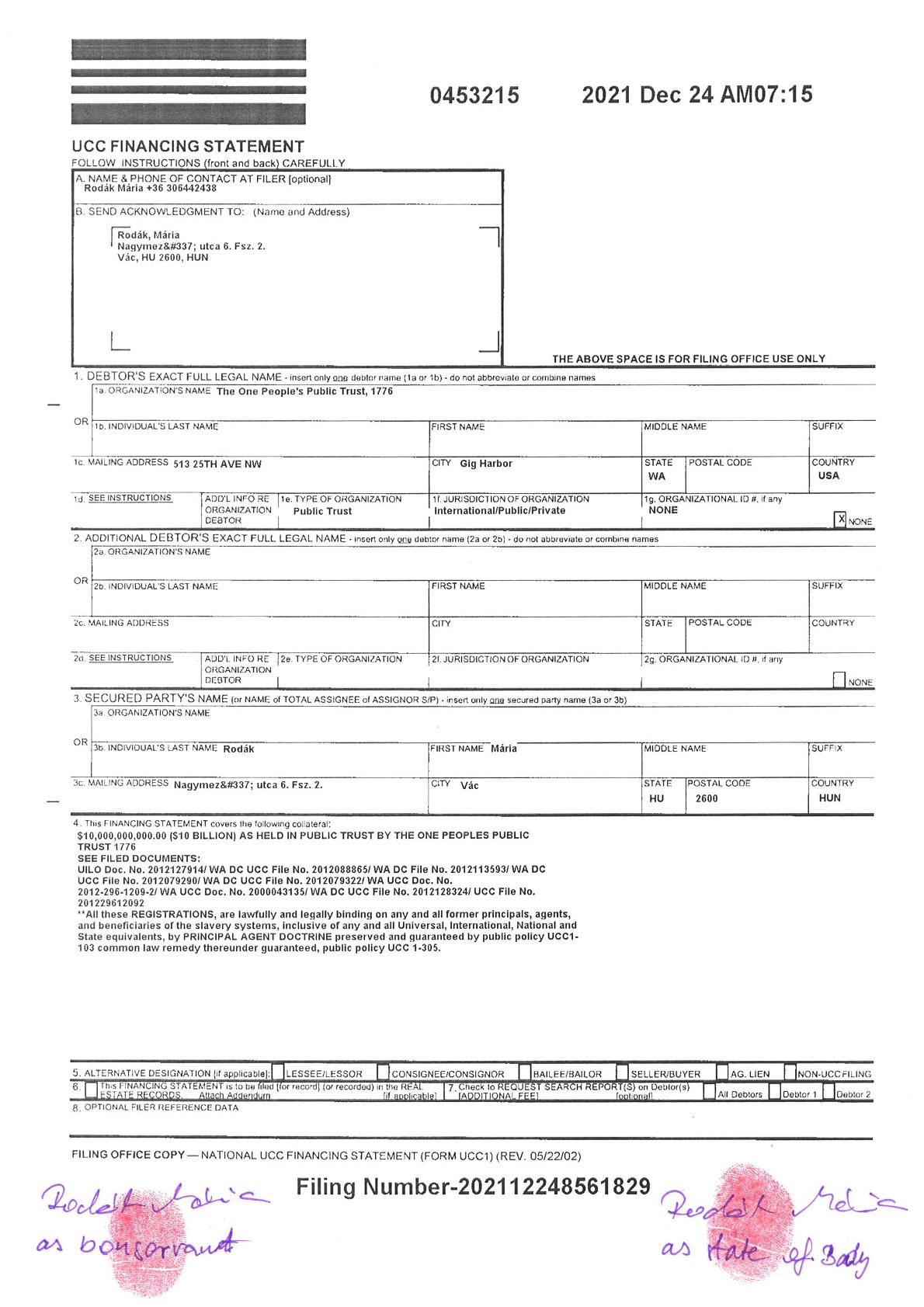 202112248561829 sz. UCC FINANCING STATEMENT(UCC FINANSZÍROZÁSI NYILATKOZAT) (UCC Dok.),és annak elfogadása ("irányadó jog”: 2012-296-1209-2 sz. WA UCC Dok.: „..Ez az egyetlen elfogadás, amit kap…”), és ezek magyar fordításai: