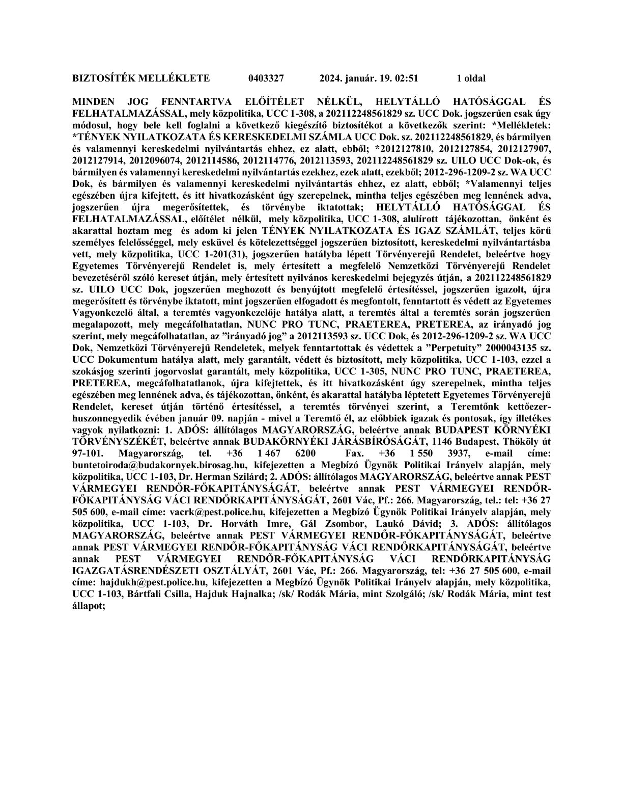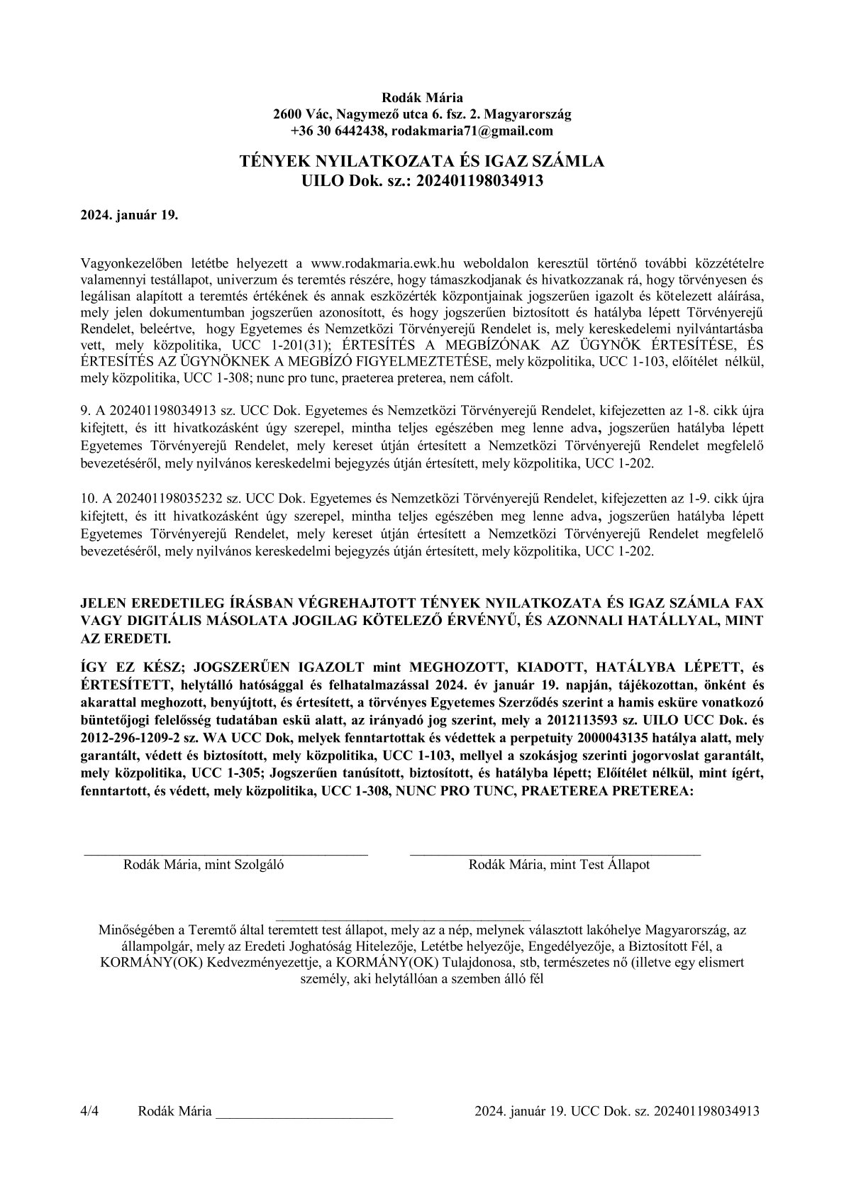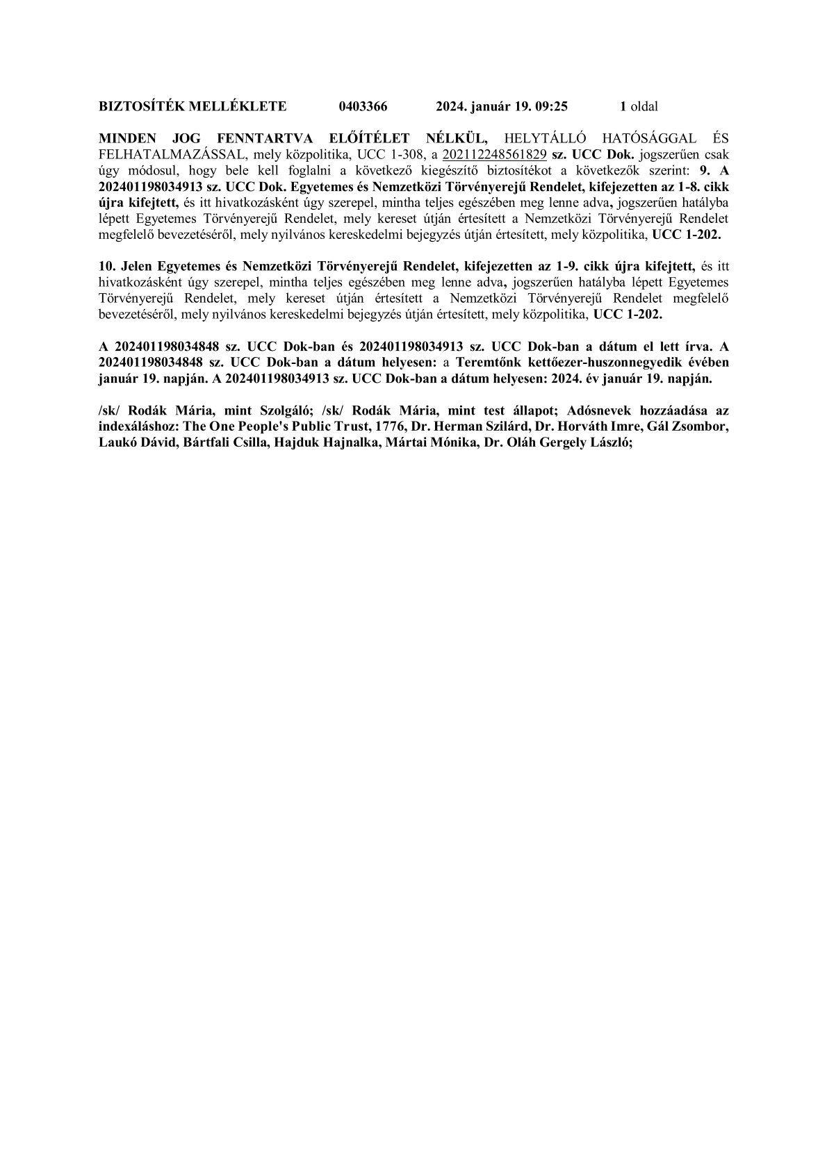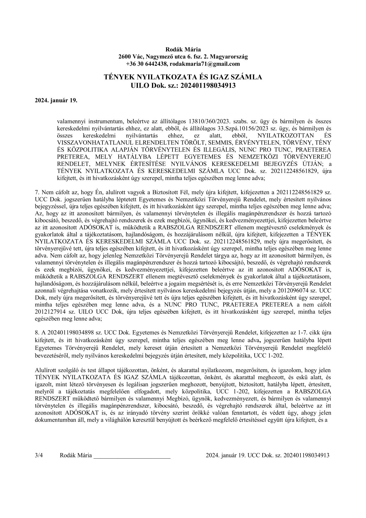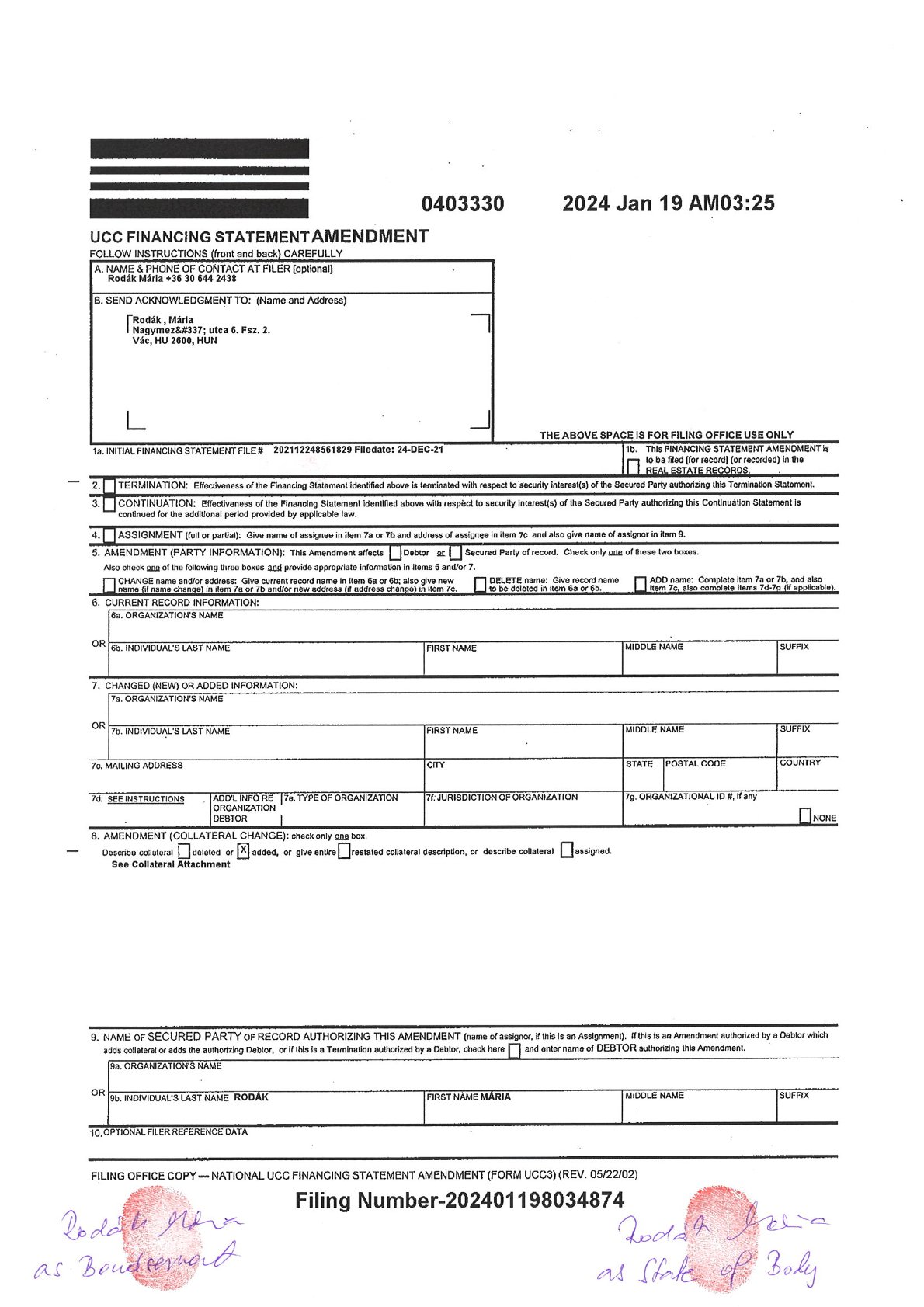 202112248561829 sz. UCC FINANCING STATEMENT(UCC FINANSZÍROZÁSI NYILATKOZAT) (UCC Dok.),és annak elfogadása ("irányadó jog”: 2012-296-1209-2 sz. WA UCC Dok.: „..Ez az egyetlen elfogadás, amit kap…”), és ezek magyar fordításai: