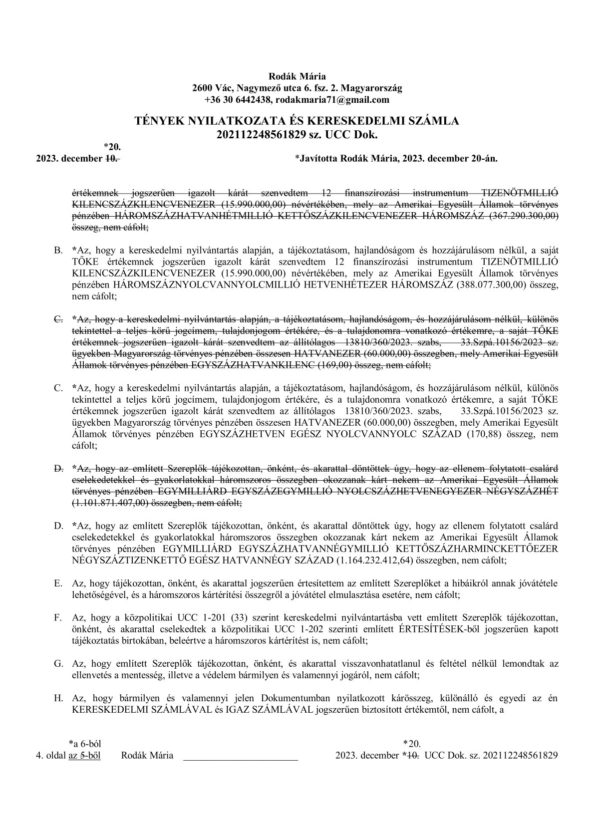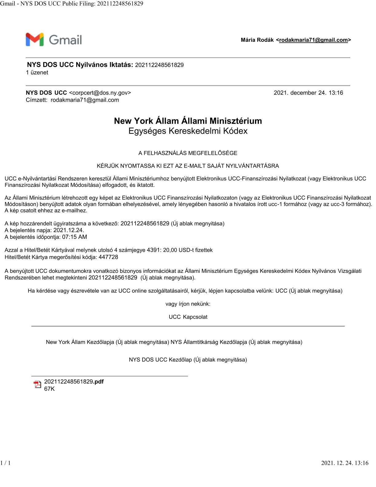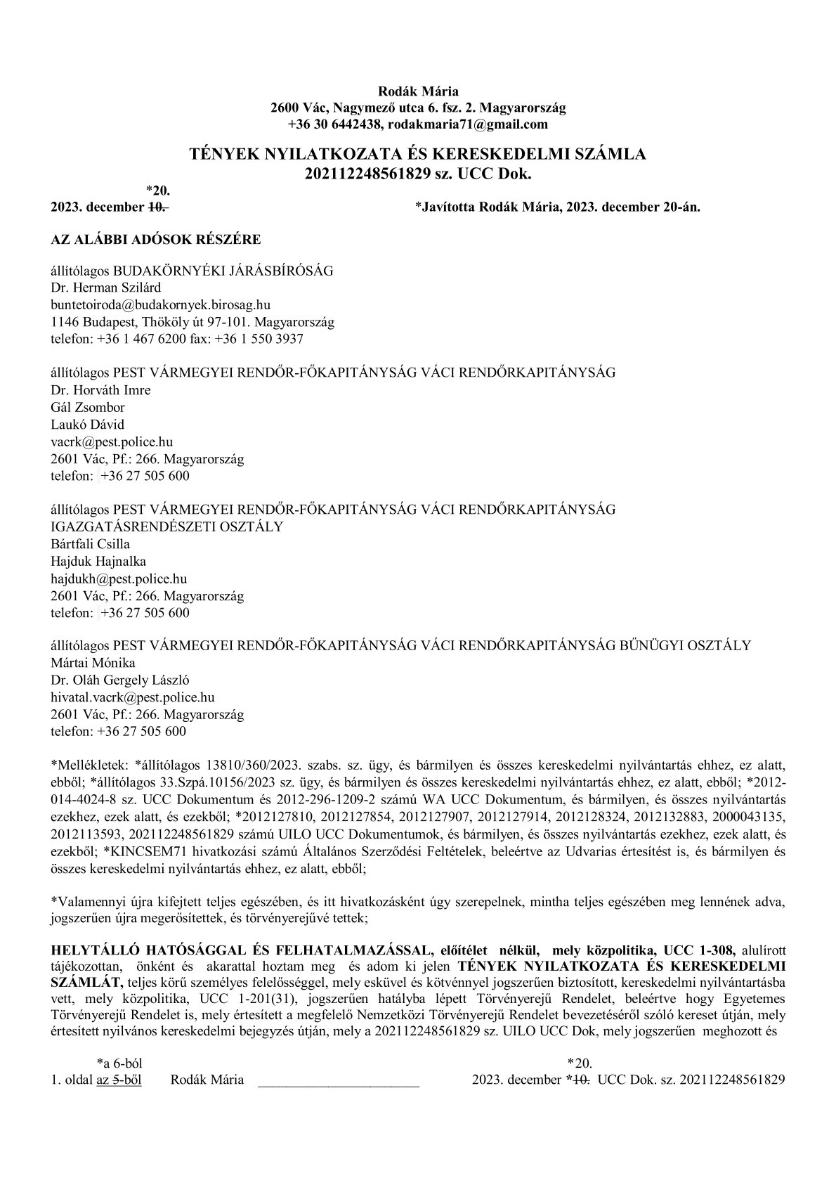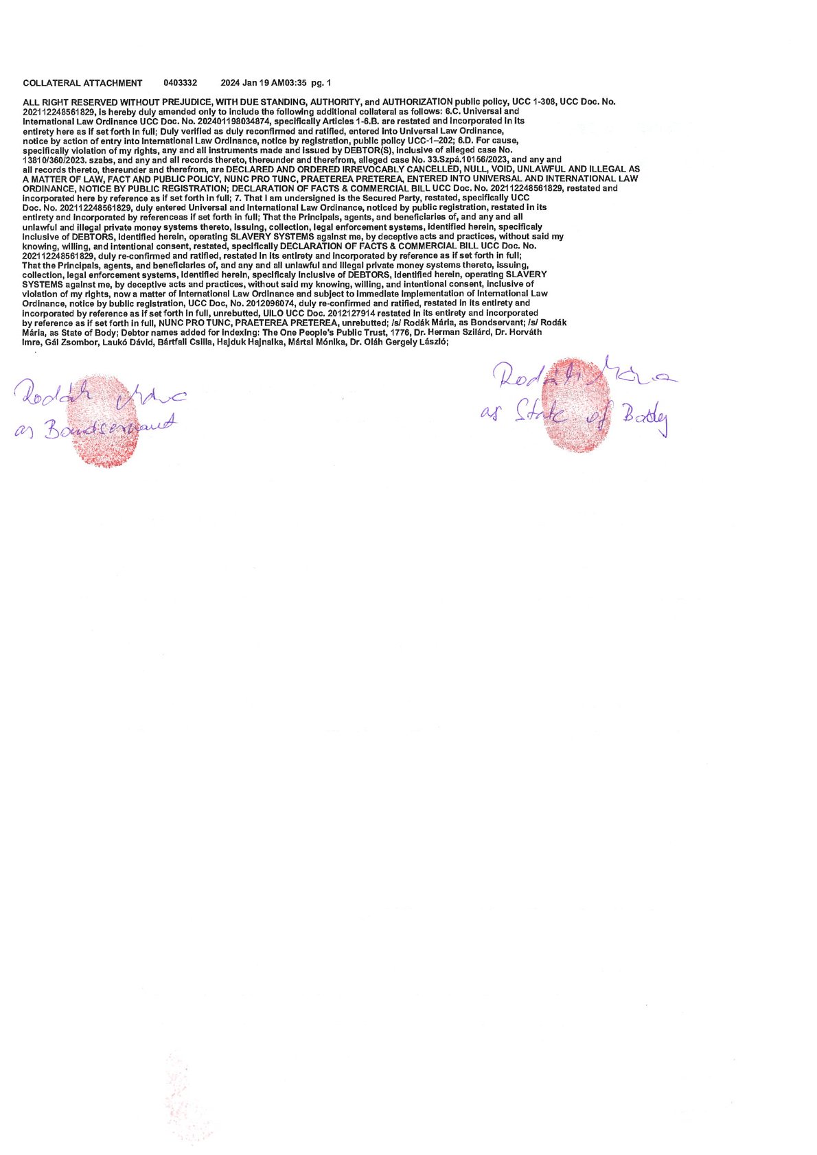 202112248561829 sz. UCC FINANCING STATEMENT(UCC FINANSZÍROZÁSI NYILATKOZAT) (UCC Dok.),és annak elfogadása ("irányadó jog”: 2012-296-1209-2 sz. WA UCC Dok.: „..Ez az egyetlen elfogadás, amit kap…”), és ezek magyar fordításai: