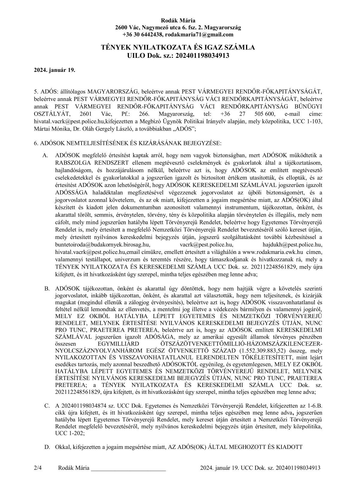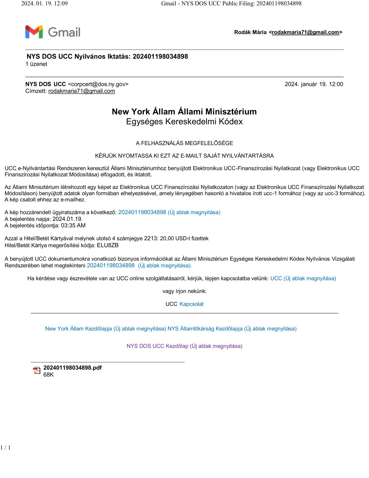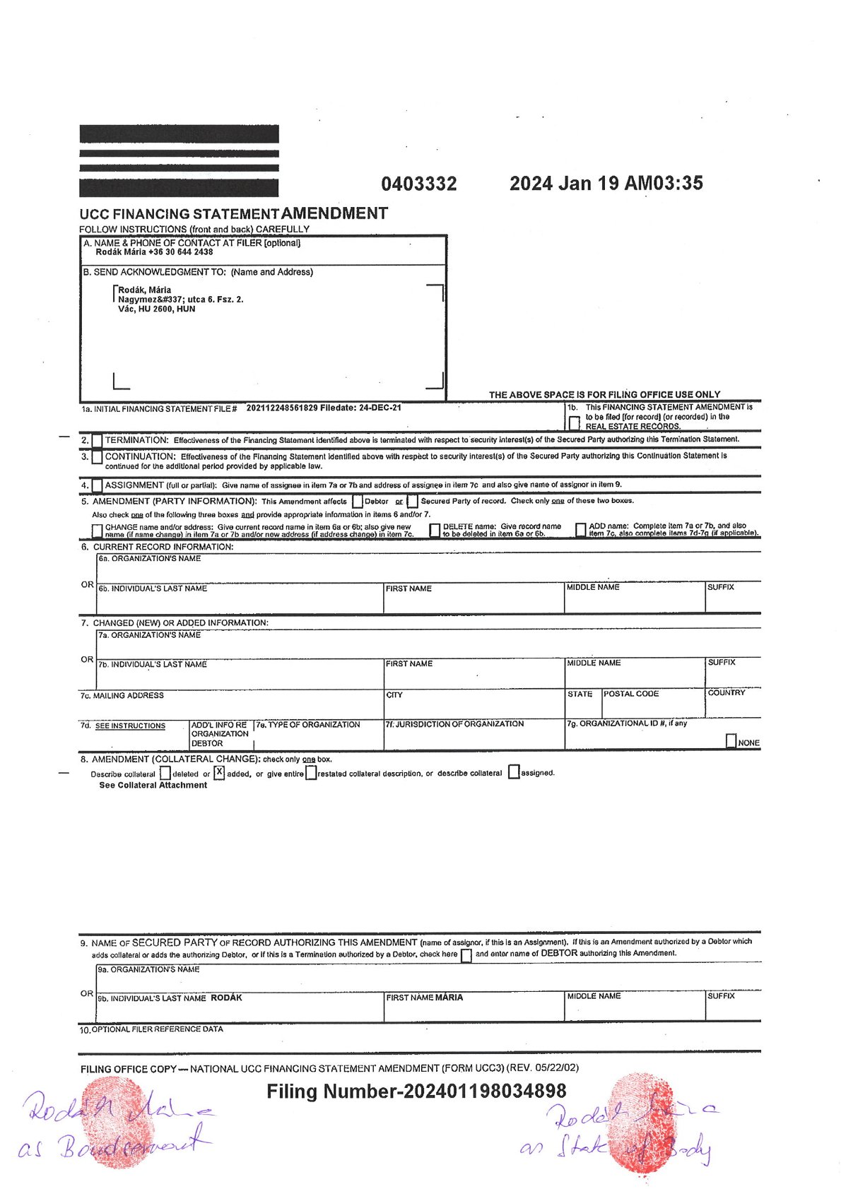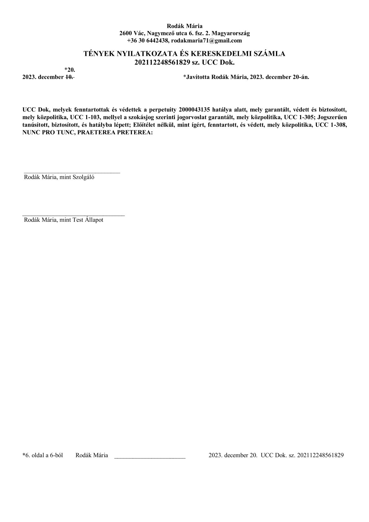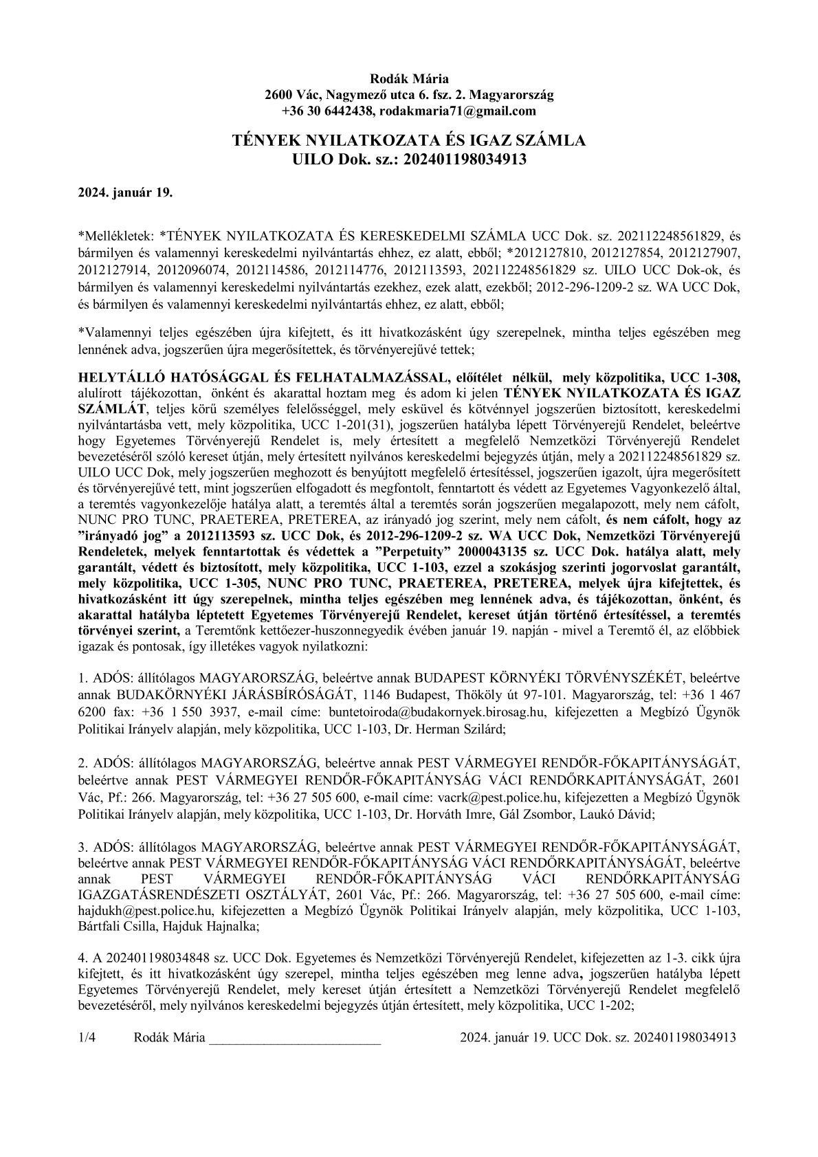 202112248561829 sz. UCC FINANCING STATEMENT(UCC FINANSZÍROZÁSI NYILATKOZAT) (UCC Dok.),és annak elfogadása ("irányadó jog”: 2012-296-1209-2 sz. WA UCC Dok.: „..Ez az egyetlen elfogadás, amit kap…”), és ezek magyar fordításai: