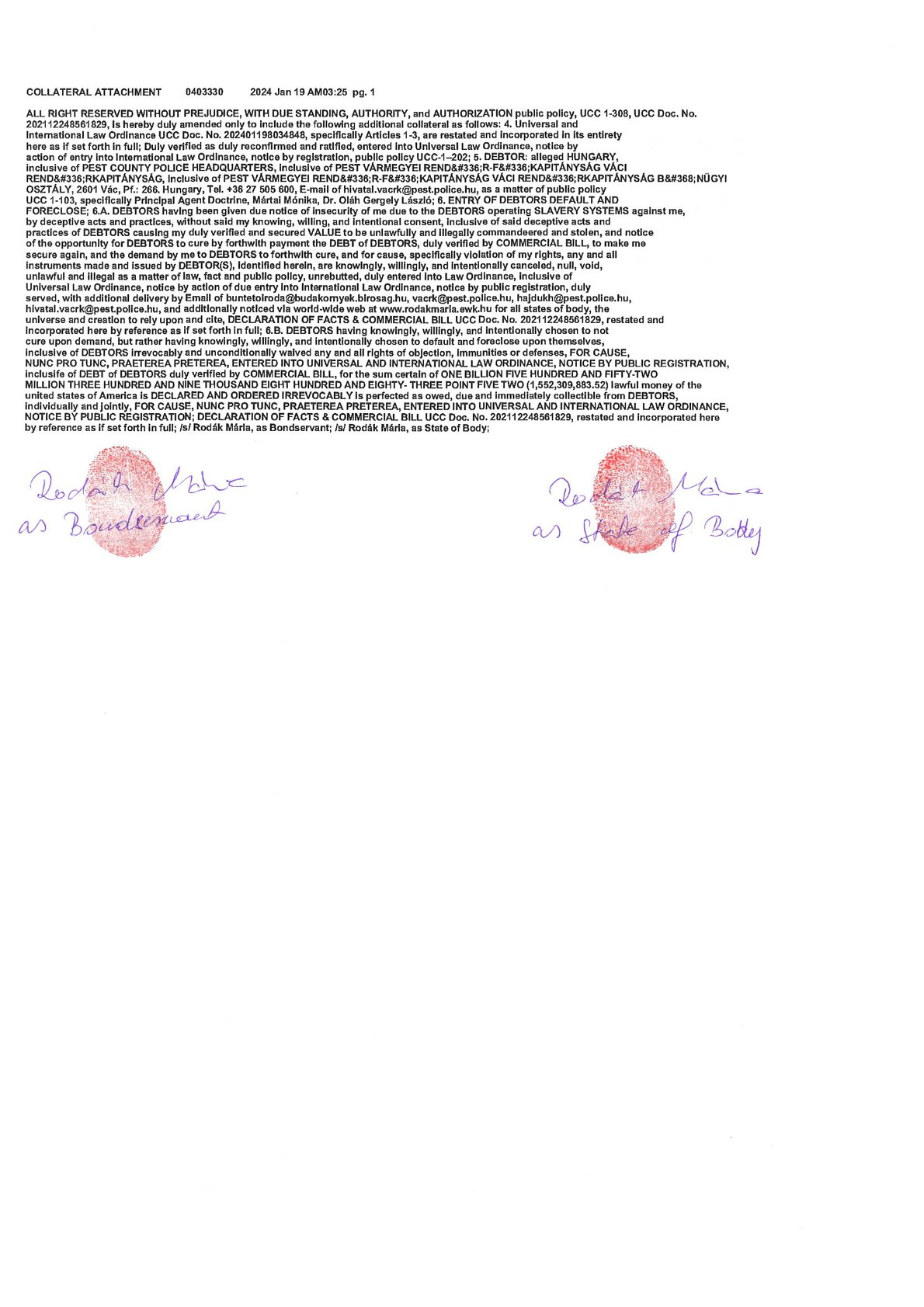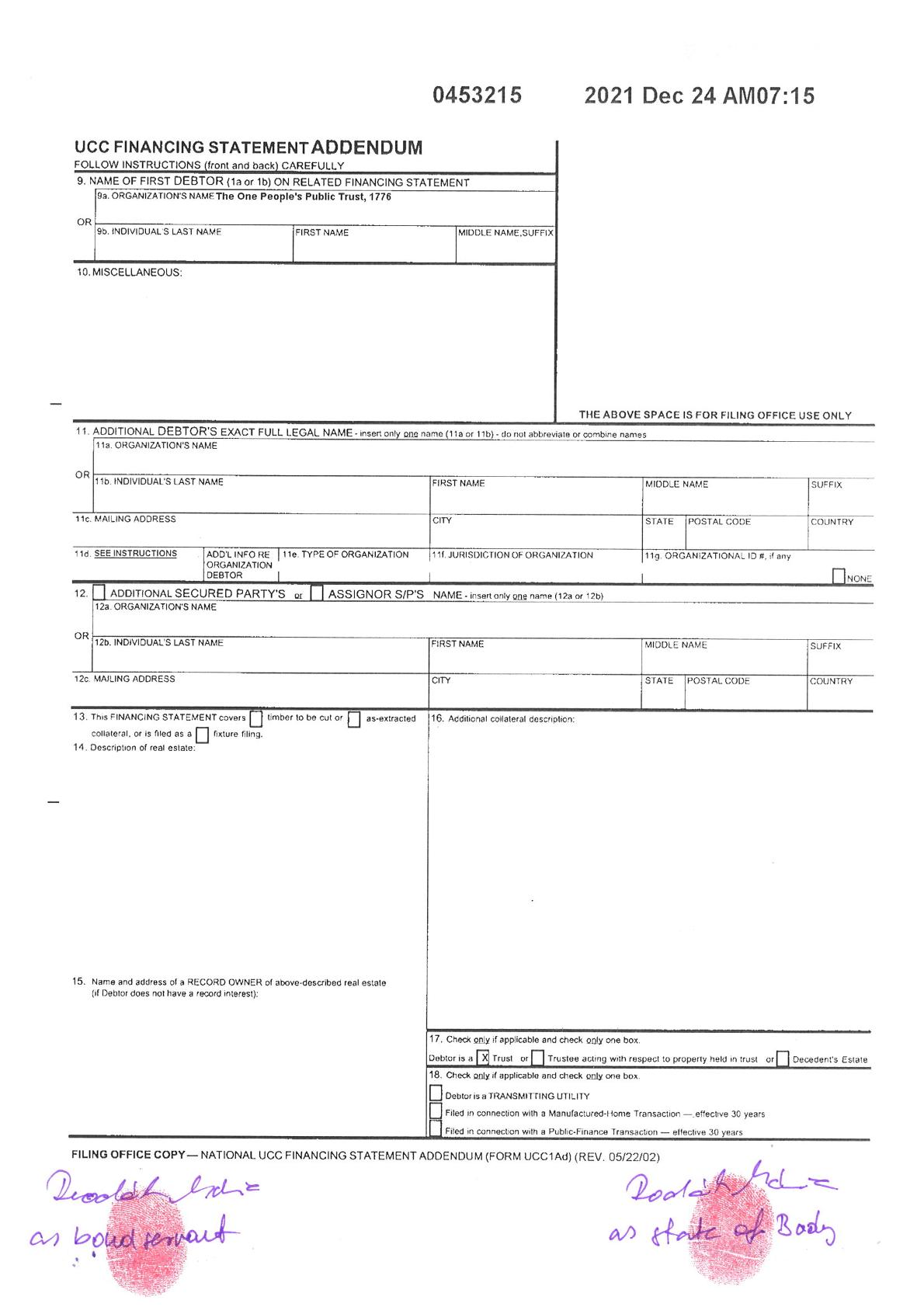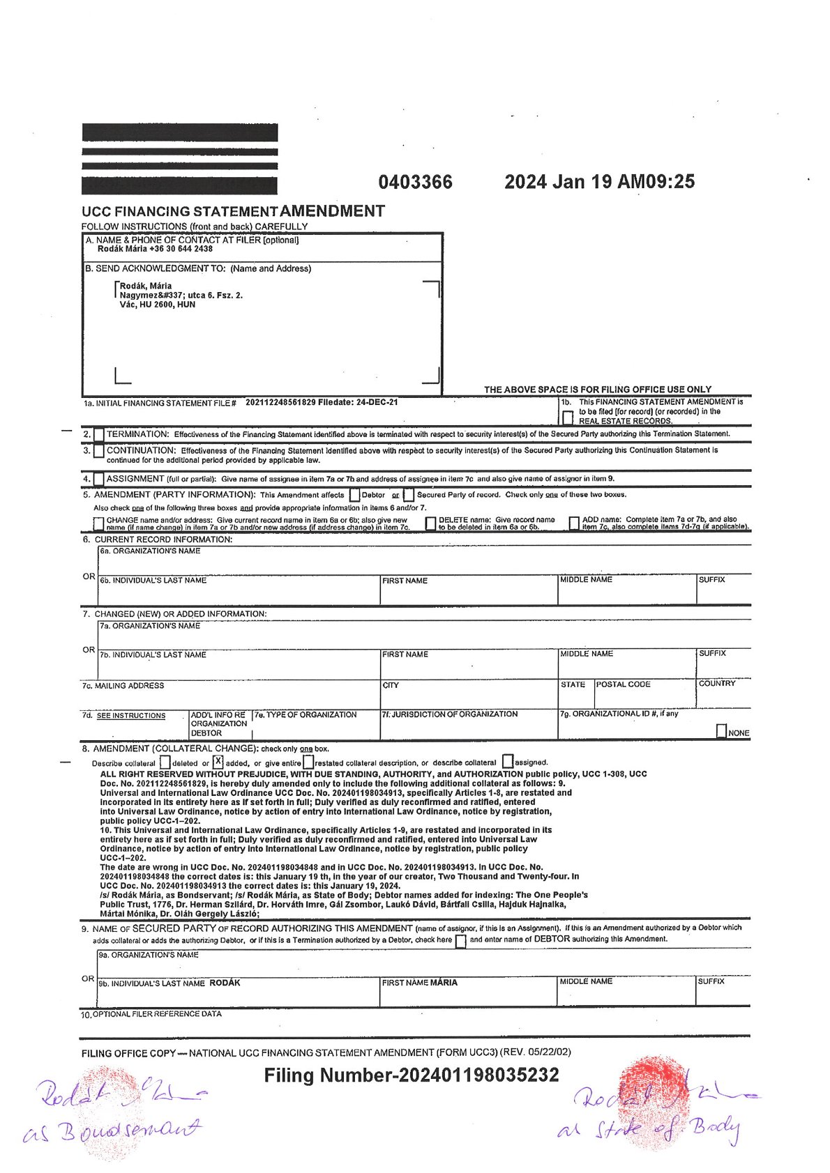 A UCC, beleértve bármilyen és valamennyi **állami, **nemzeti, **nemzetközi és **egységes ekvivalensét is, jogszerűen BEJEGYZETT kizárólagos és megsemmisíthetetlen jogcímmel, tulajdonjoggal, és jogokkal, mely jogszerűen biztosított a bolygón élő összes embernek, egyformán, Egységesen, UCC nyilvántartási számai 2000043135 (az eredeti nyilvántartott ”perpetuity”), 2011055259, 2011051841, 2011055260, 2011125781 (az engedményezéssel BEJEGYZETT ajándék), 2012012675 és 2012025545 (az ajándék elfogadásának BEJEGYZÉSE).