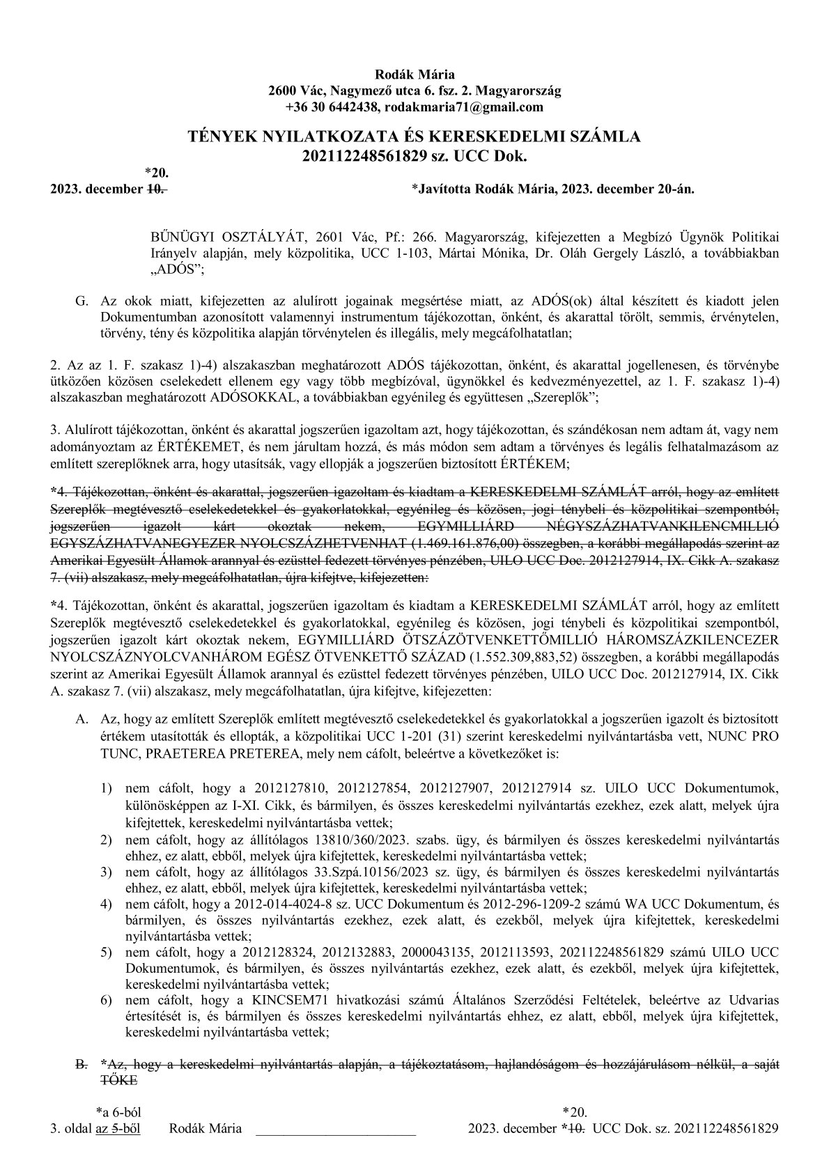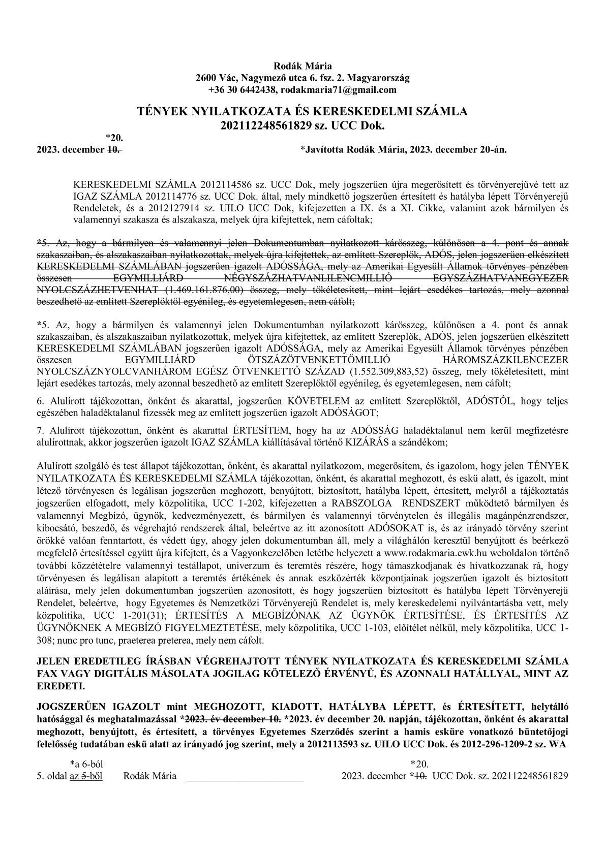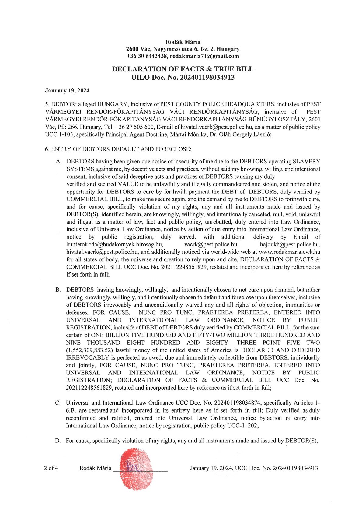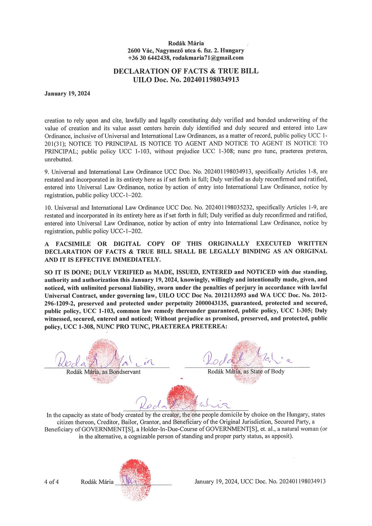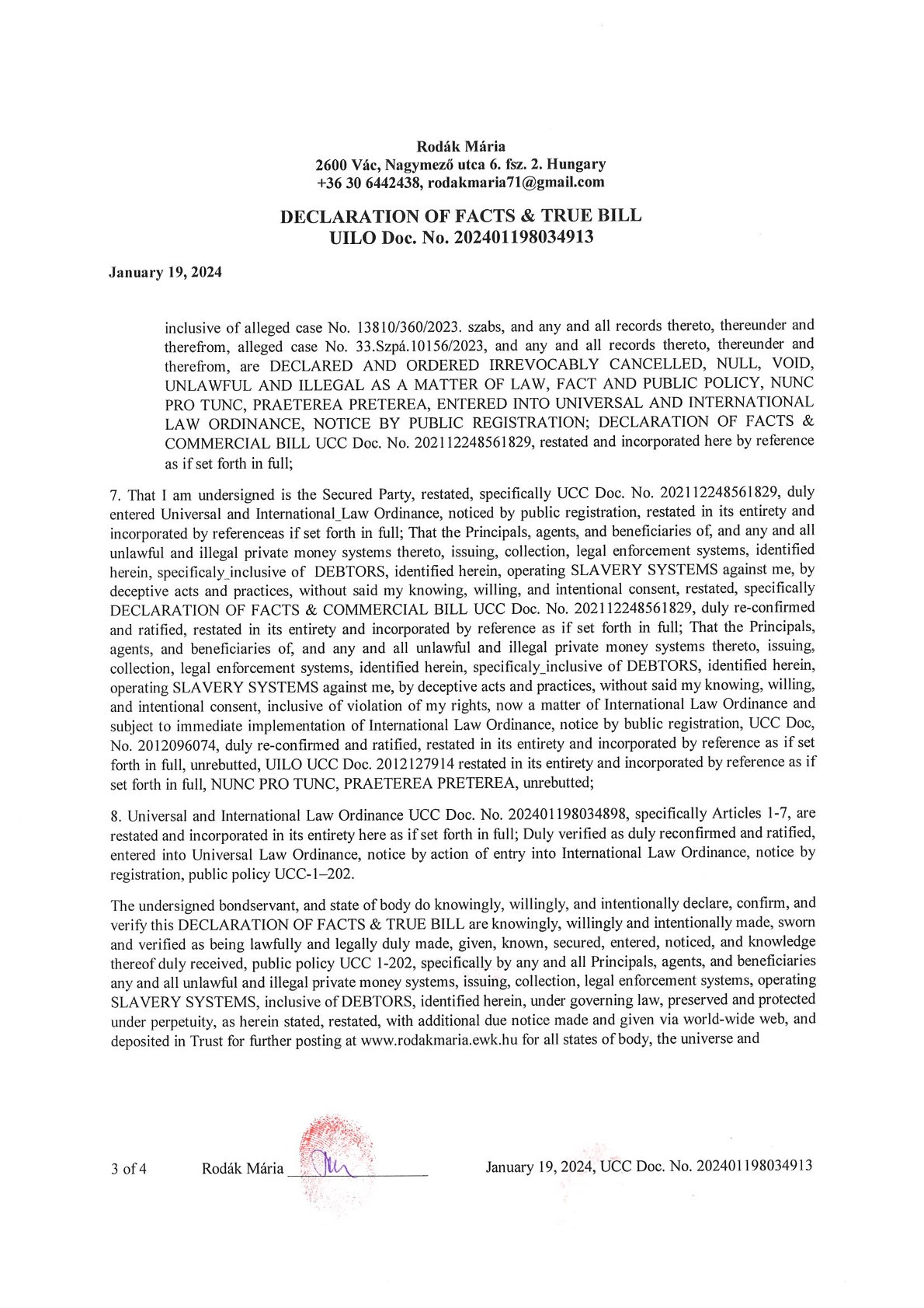 DECLARATION OF FACTS & COMMERCIAL BILL Doc. No. 202112248561829 és magyar fordítása (TÉNYEK NYILATKOZATA ÉS KERESKEDELMI SZÁMLA)