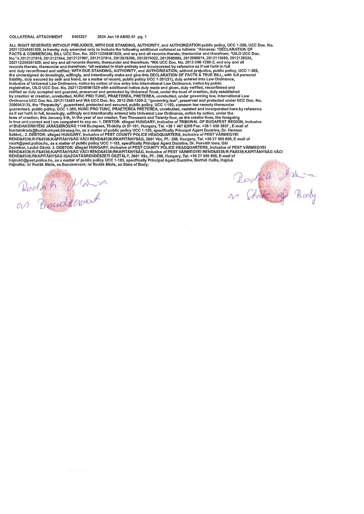 202112248561829 sz. UCC FINANCING STATEMENT(UCC FINANSZÍROZÁSI NYILATKOZAT) (UCC Dok.),és annak elfogadása ("irányadó jog”: 2012-296-1209-2 sz. WA UCC Dok.: „..Ez az egyetlen elfogadás, amit kap…”), és ezek magyar fordításai: