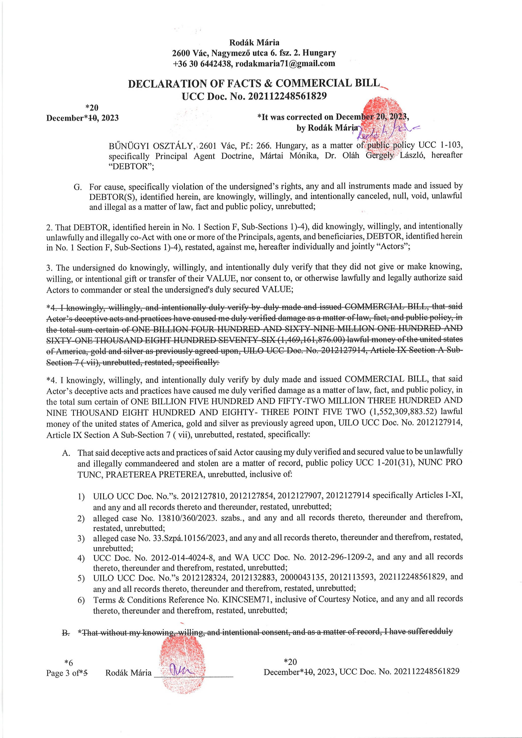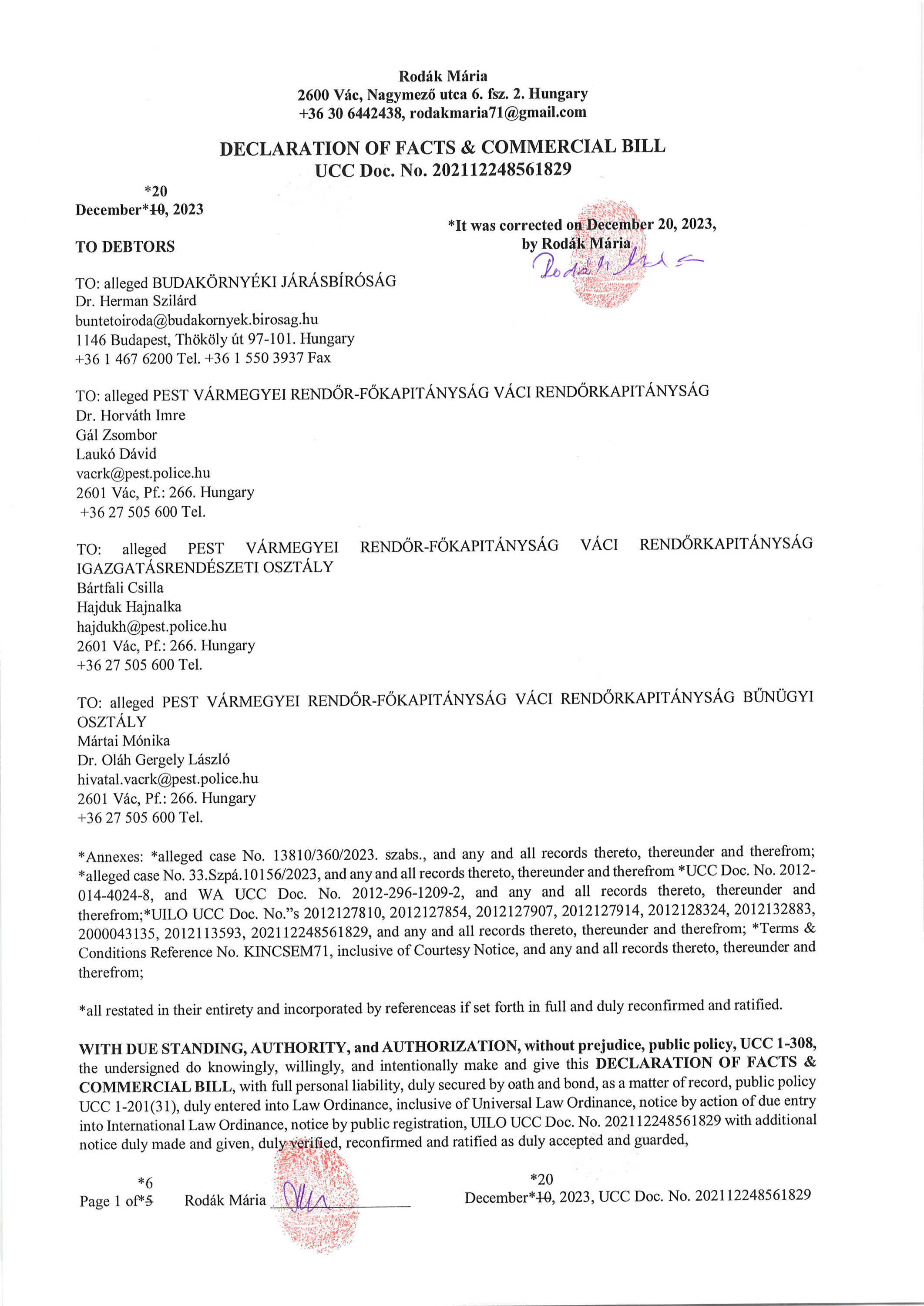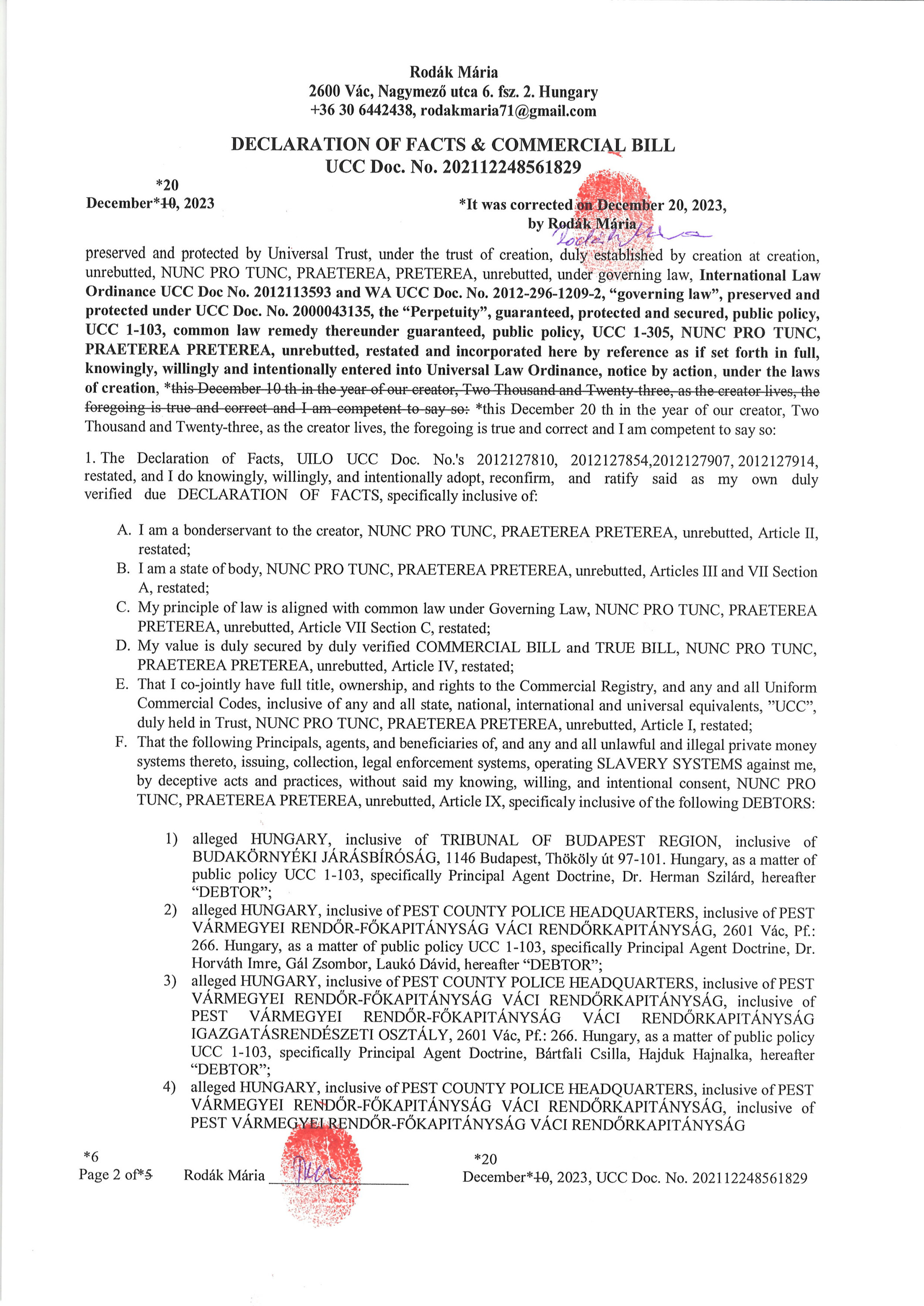 DECLARATION OF FACTS & COMMERCIAL BILL Doc. No. 202112248561829 és magyar fordítása (TÉNYEK NYILATKOZATA ÉS KERESKEDELMI SZÁMLA)