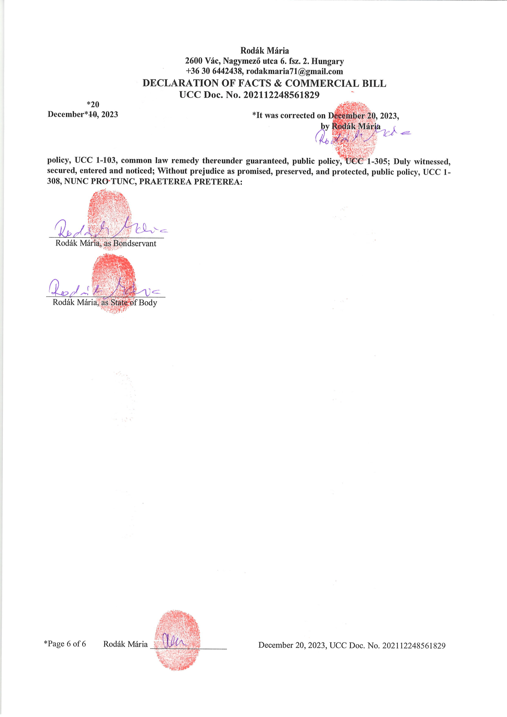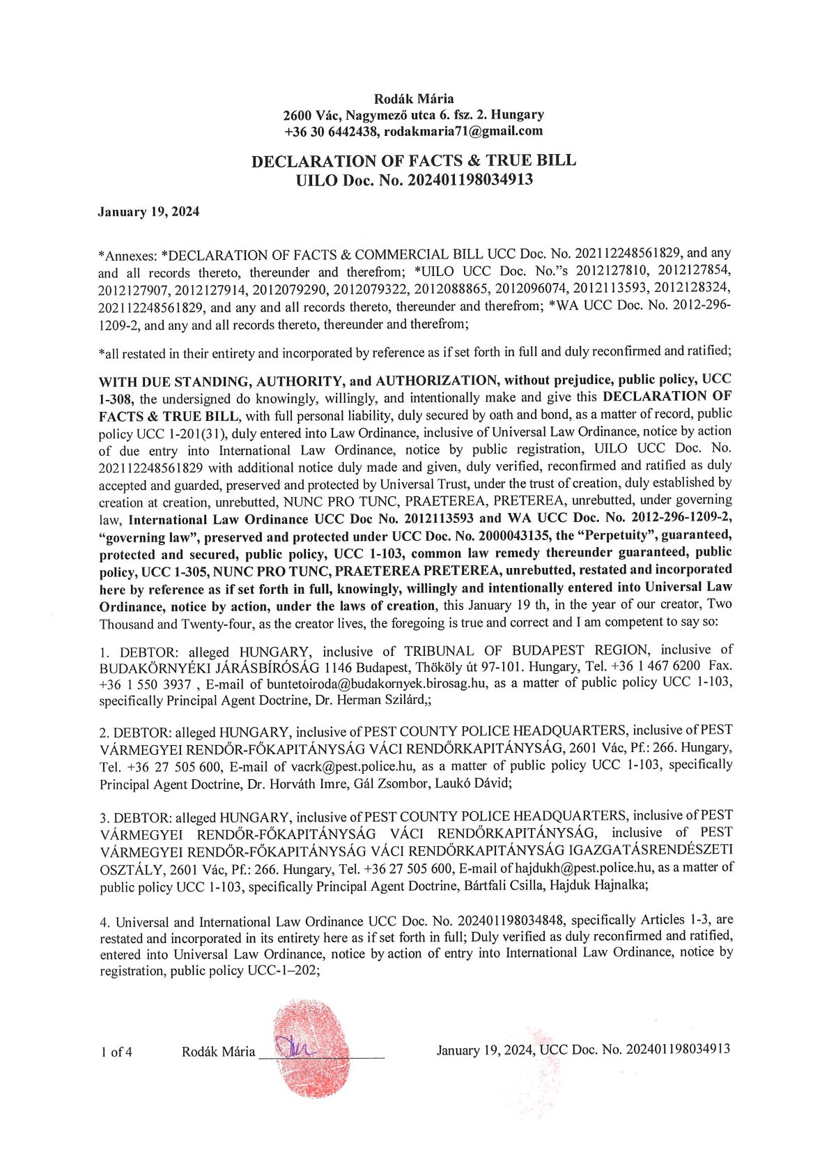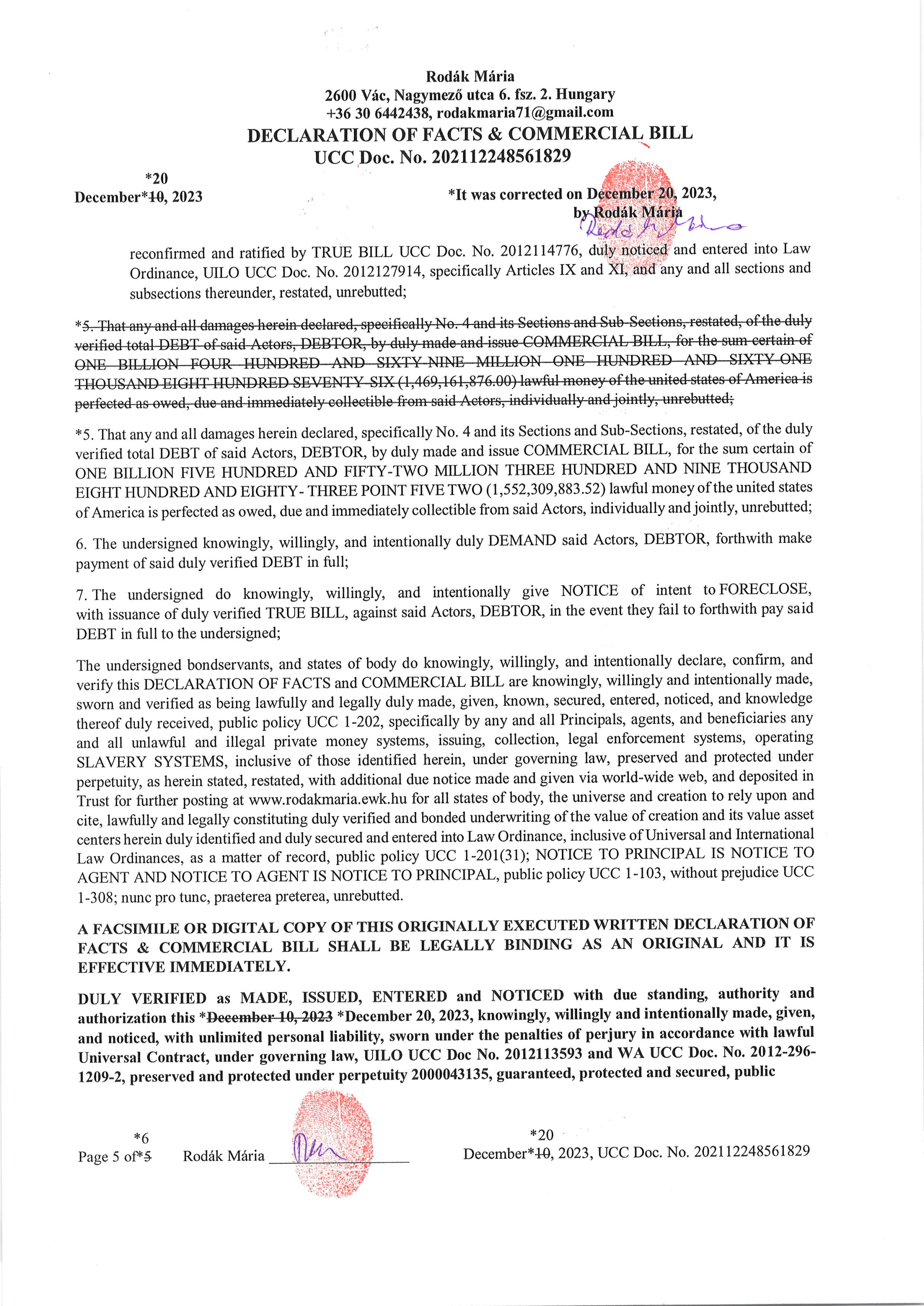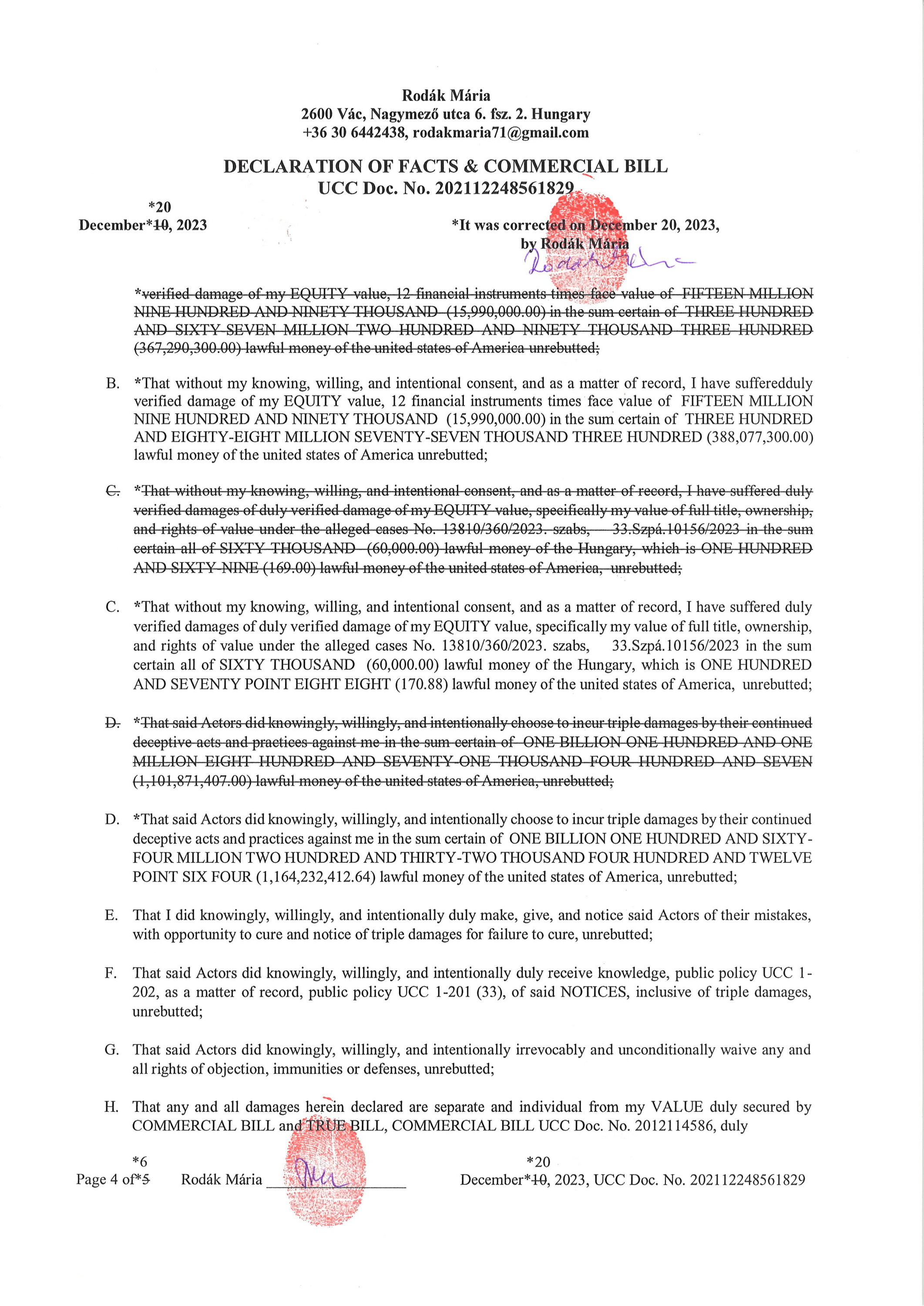 DECLARATION OF FACTS & COMMERCIAL BILL Doc. No. 202112248561829 és magyar fordítása (TÉNYEK NYILATKOZATA ÉS KERESKEDELMI SZÁMLA)